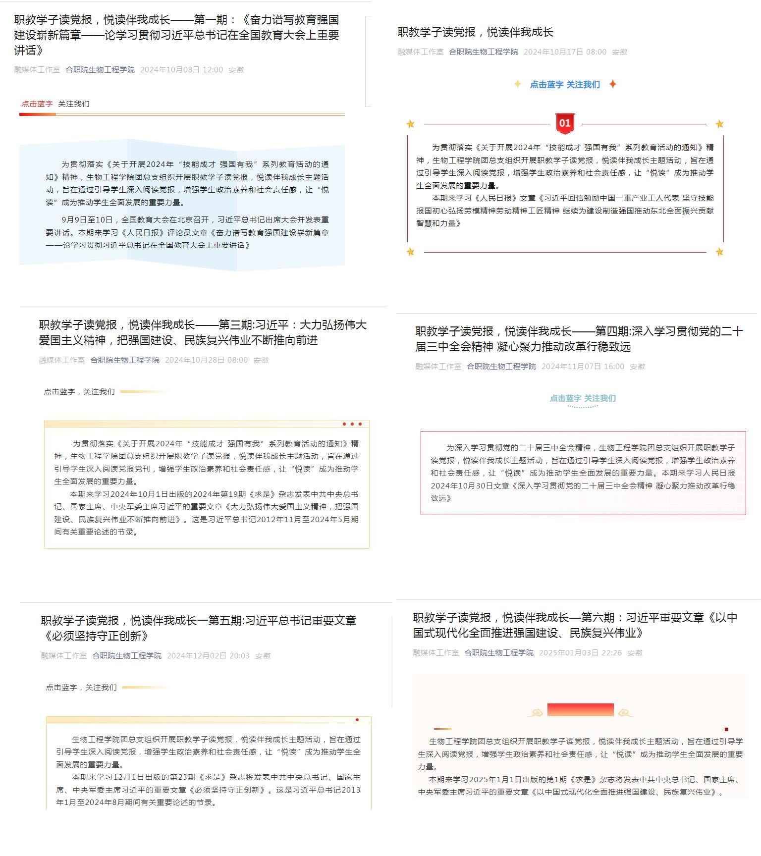 为全面贯彻党的二十大和二十届二中、三中全会精神,深入学习贯彻习近平总书记关于职业教育的重要指示批示精神,落实立德树人根本任务,加强职业学校学生思想政治教育,培养德技并修的高素质技能人才,自2024年10月以来,beat365中国官方网站依托官方微信公众号平台在全院范围内组织开展了“职教学子读党报,悦读伴我成长”活动。平台已推送6期《人民日报》、《求是》有关篇目原文,引导学生深入学习党的理论,了解国家大事,坚定理想信念,为培养担当民族复兴大任的时代新人注入新的活力。