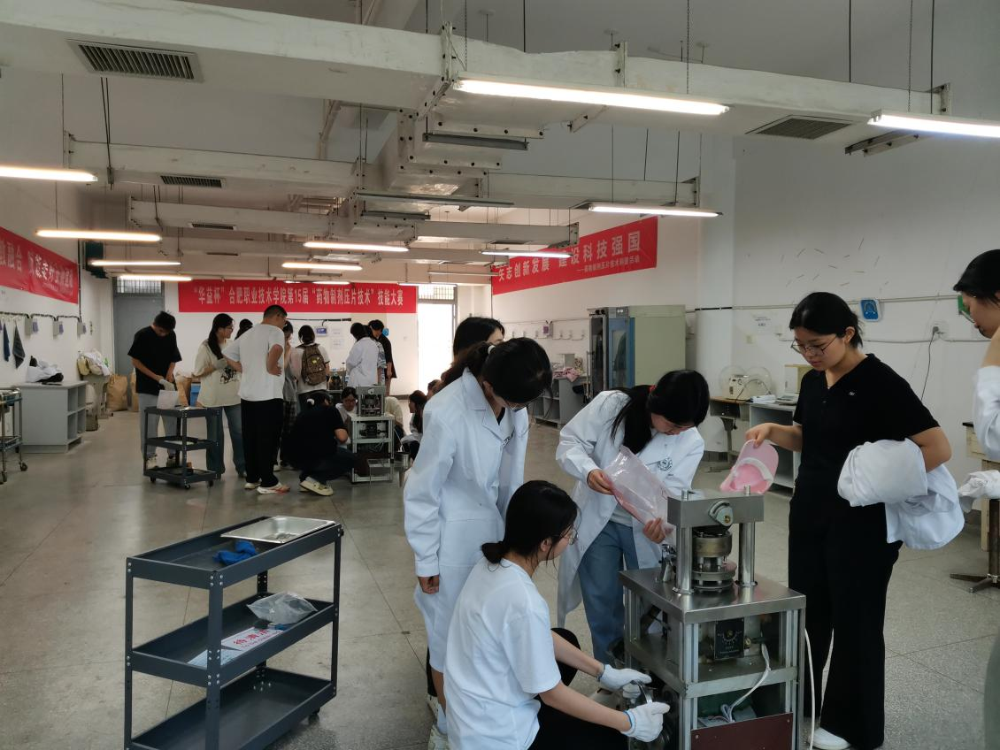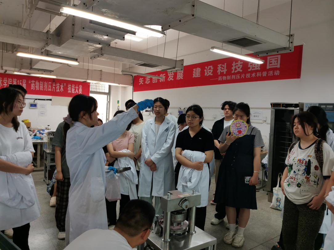 为积极响应2025年安徽省科技活动周“矢志创新发展 建设科技强国”主题号召,6月5日下午,beat365中国官方网站在生化楼制剂中心成功举办了一场别开生面的“药物制剂压片技术”科普展示活动。本活动聚焦药品生产领域的核心技能,通过不同模拟场景展示固体制剂片剂如何从物料到成品过程,体现了现代制药技术的先进性和实践应用性。活动吸引了本学院食品等专业70余人次参加。