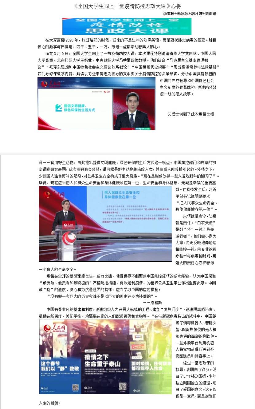 值此三月,草长莺飞,春意且浓,就在举国百姓共同抗疫的时刻,教育部社科司与人民网联合组织的“全国大学生同上一堂疫情防控思政大课”,将高校思想政治理论的教学优势转化为支持防疫斗争的强大力量。为积极响应校团委的号召、配合校团委的工作,我院团总支组织全院师生线上收看“思政大课”,向全国各地的具有雷锋精神的抗疫英雄学习。