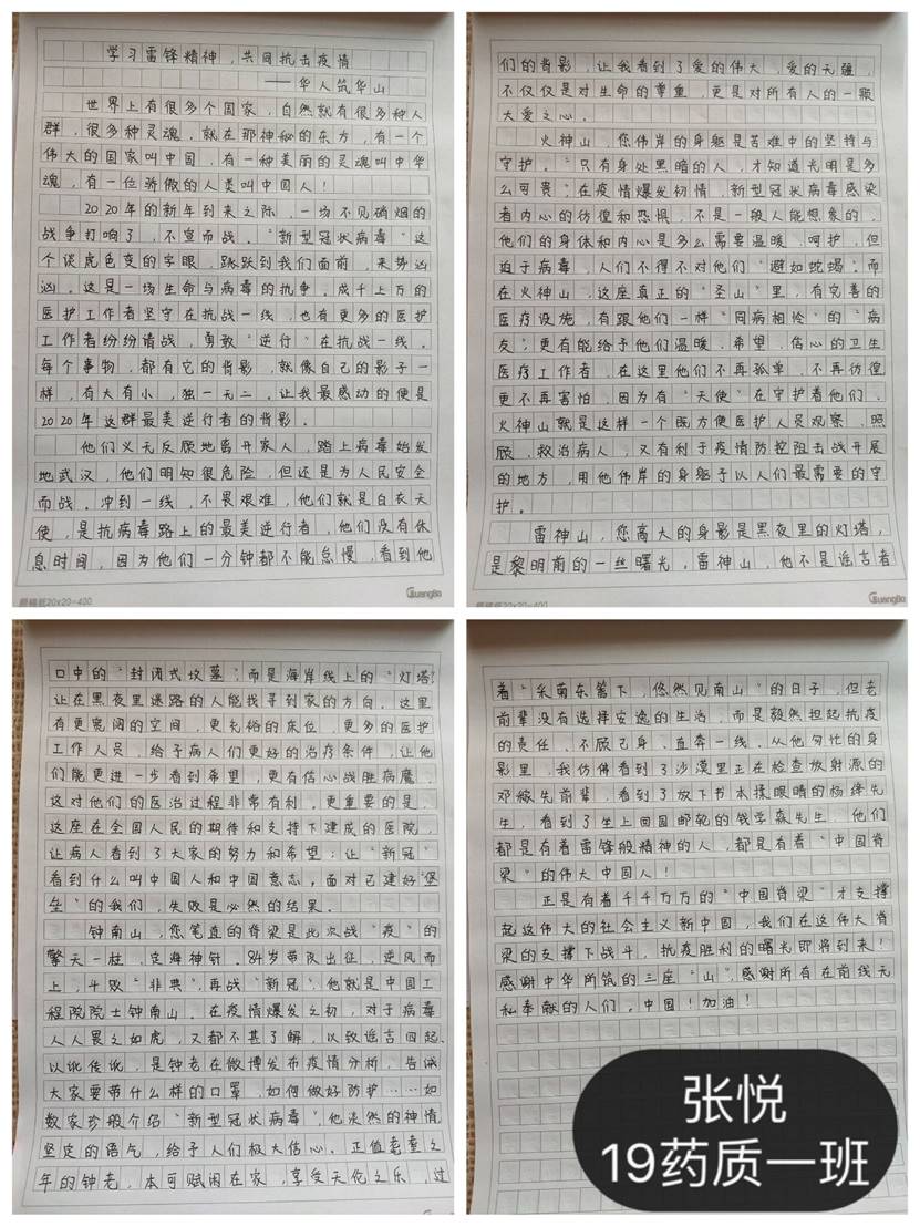 为了继承并弘扬新时代雷锋精神,beat365中国官方网站发起了以“学习雷锋精神,共同抗击疫情”为主题的征文活动,鼓励学生用自己的语言、用自己的文字、用自己的思想去创作并传递正能量。活动一经开启,就受到学生的热烈响应。我院学生纷纷拿起手中的笔,化文字为斗争力量,与奋战在一线的英雄们共同抗击疫情。通过开展此项活动,充分展示我院学生的文学修养,大力弘扬且深入学习新时代雷锋精神,深刻表达了我院学生对战胜疫情的热切心愿,鼓舞我们坚定抗击疫情的必胜信心。(编辑:周媛)