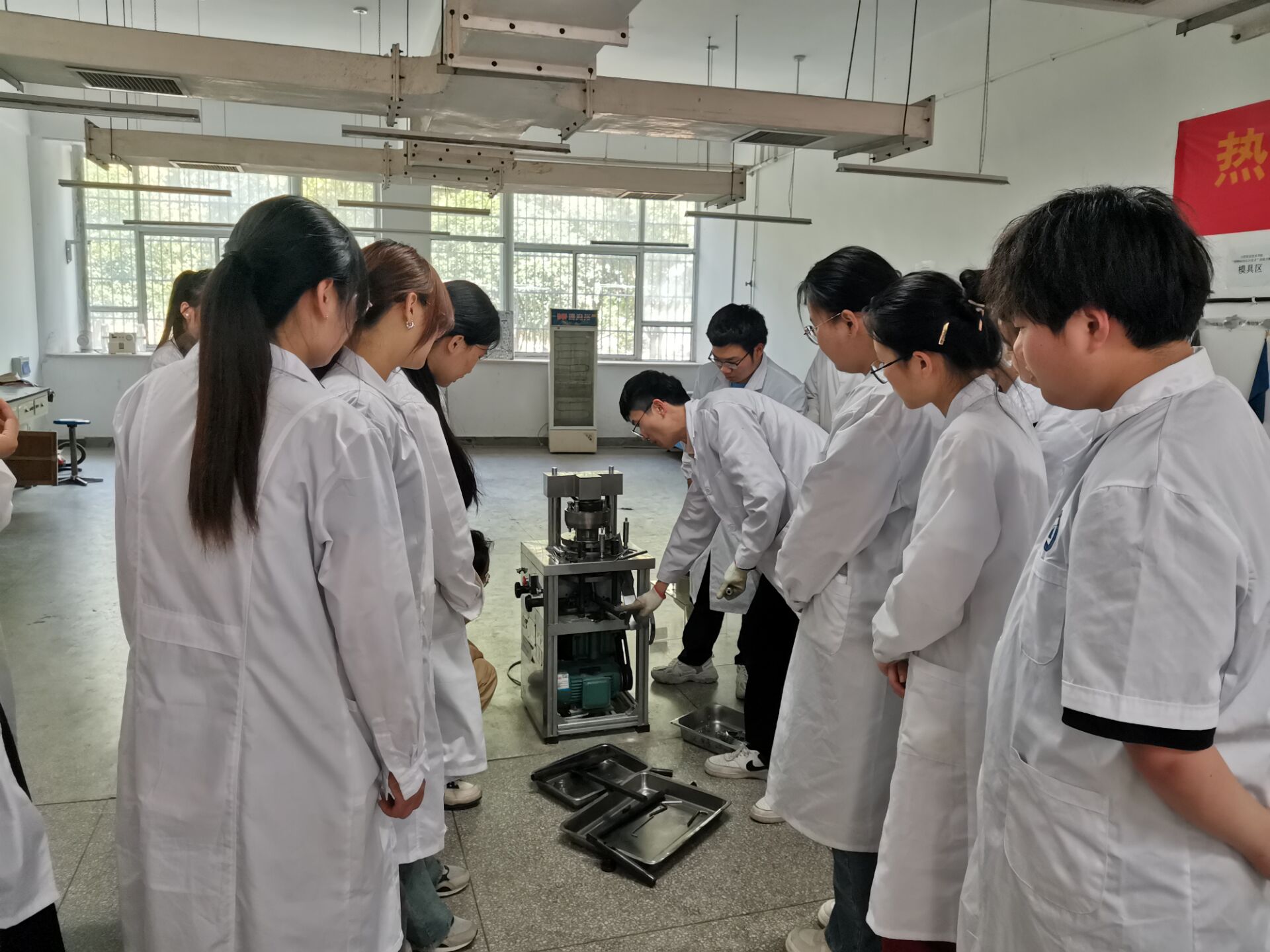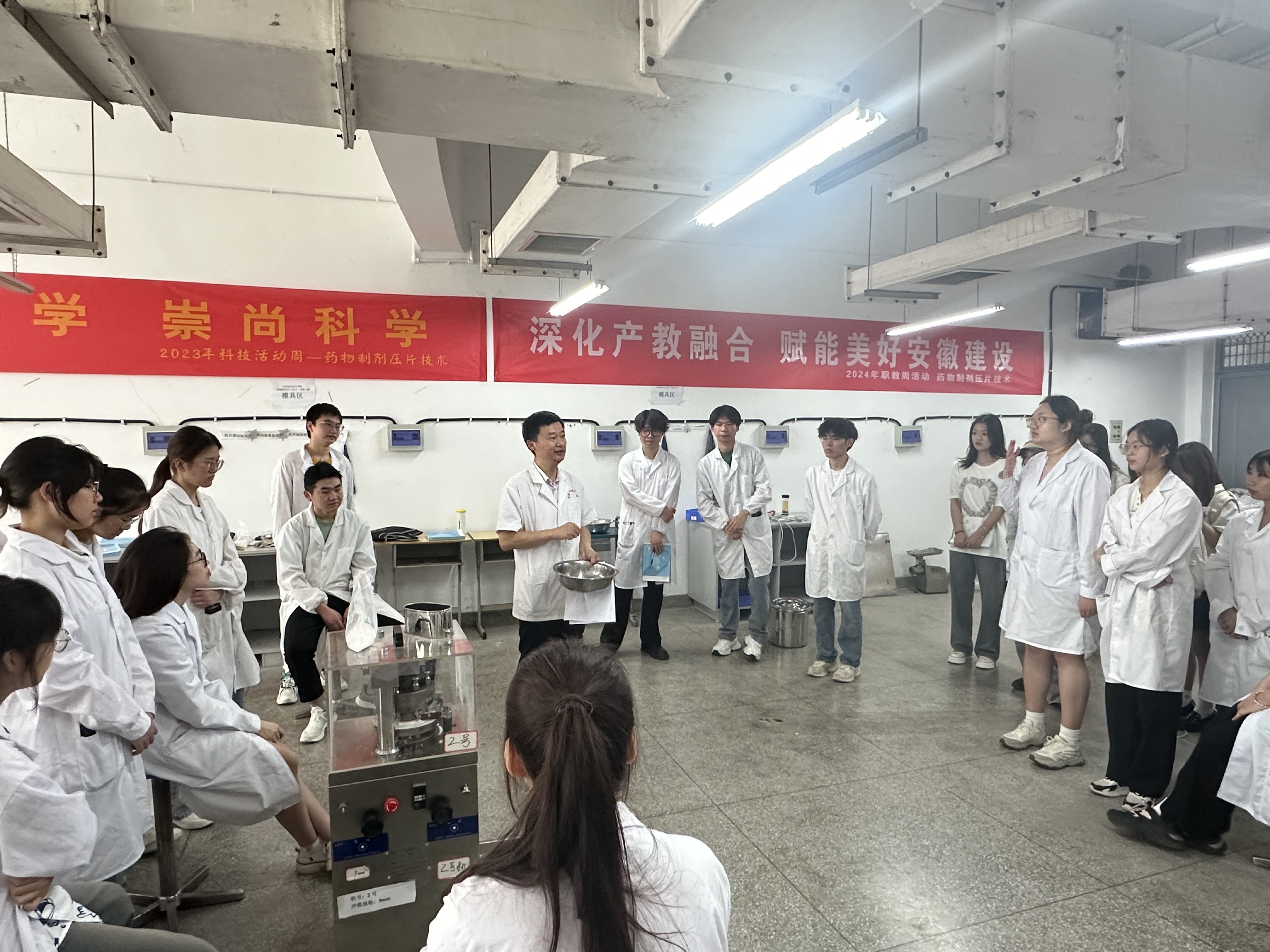 为贯彻落实“深化产教融合,赋能美好安徽建设”职教周主题精神,5月22日在鼓山校区药物制剂实训中心开展“药物制剂压片技术”科普体验活动。本次活动集中展示现代制药技术和制药设备,涉及模拟药品生产企业的片剂岗位、胶囊制备岗位和包衣岗位及其关键设备旋转压片机、全自动胶囊填充机及片剂高效包衣机等实操内容。beat365中国官方网站第一党支部范高福工作室“双带头人”范高福、韦梦强两位老师担任讲解员,接待校内园林类专业、食品类专业及其他专业参观人员80余人次。