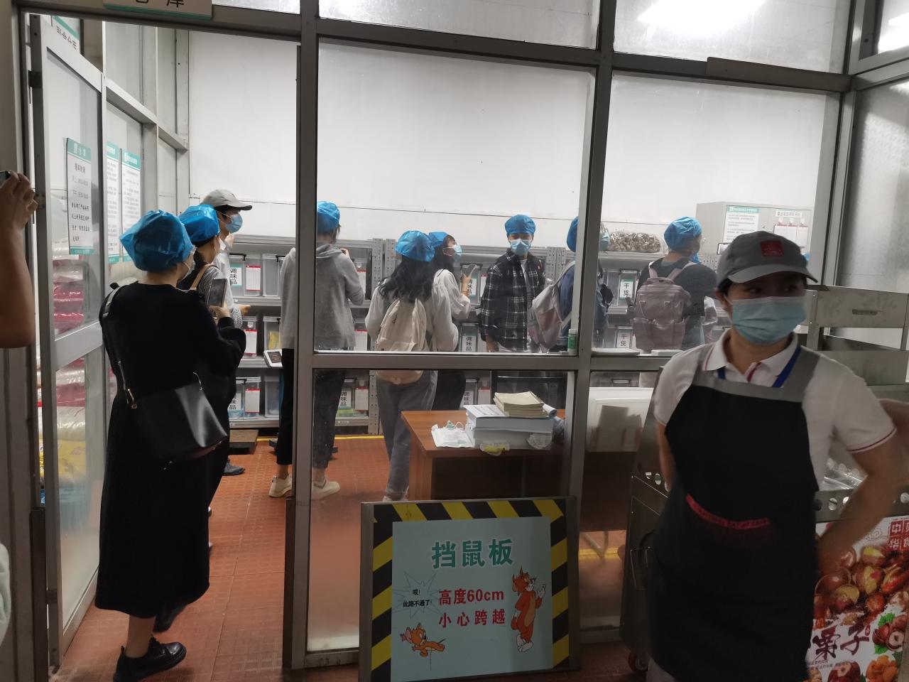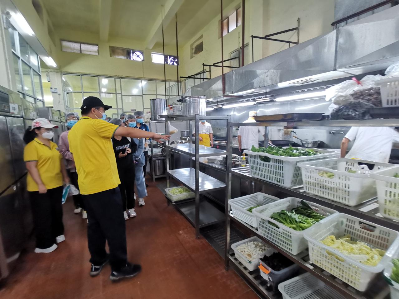 学员们在学校师生事务保障中心第一党支部符万祺书记、冯运斌老师的带领下,分组进行参观与学习。首先来到位于第一食堂后方的由365英国上市官网与海口市美兰区食品药品监督管理局共建的校园食品安全工作室,在工作人员的示范下,学员们对食堂供应的蔬菜样品进行了农药残留等测试分析,了解了学校师生事务保障中心为了保障师生舌尖上的安全,各类食品从进货到上桌,都经过了严格的筛选、测试和把关。随后,学员们来到学校第一、第二食堂,现场观摩后厨操作过程,现场观摩后厨操作过程。食堂主管化身为导游,带领学员们走进食堂后厨,一路参观蔬菜清洗间、加工间、切配间、食材存储间、碗筷清洗间、消毒间等,同时介绍了大型机械设备如灶具、消毒柜等相关设施的工作流程和使用方法,使同学们对食堂的各种硬件设施有了初步认识和了解,使得同学们对食堂的日常工作有了更加直观的感受。