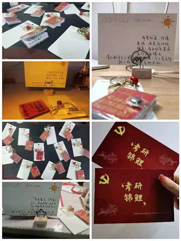 为增强支部考研党员的信心,同时充分调动学生党员为同学服务的积极性,12月12日至13日365英国上市官网本科第二学生党支部开展“研途送温暖”活动。活动开始前,支委为考研党员同志购买明信片和纪念钥匙扣。12月12日中午,支部其他党员一起为考研的党员同志书写句句祝福话语,默默派送到每个考研党员同志的宿舍书桌,精心地准备温暖的小惊喜。本次为考研党员同志送温暖活动,不仅以正能量的方式激励了考研学子,鼓舞奋战考研的学子们以积极的心态投入备考冲刺阶段,也彰显了党支部的人文关怀,有助于营造支部团结温馨的氛围。辛苦学习了一天回到宿舍的党员同志们在看到书桌上的纪念品和卡片,纷纷表示感动和感谢!