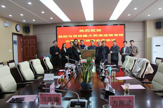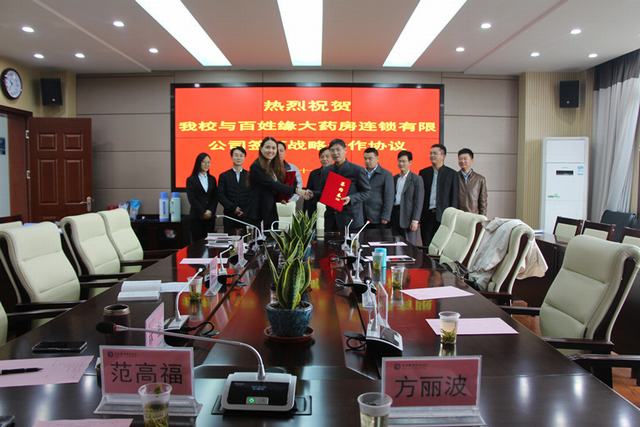 11月16日,安徽百姓缘大药房连锁有限公司行政总监洪兰以及该公司人力资源部、培训部、拓展部负责人一行来我校签订“店长储备人才班”和校内“实体药房”合作战略协议。副校长周晓隆及我院相关负责人出席签约仪式。签约仪式由我院党总支书记宁业群主持。