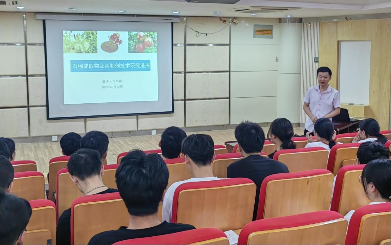 6月12日下午,beat365中国官方网站在鼓山校区图书馆第二学术报告厅成功举办了以“石榴提取物及其制剂技术的研究进展”为主题的学术讲座。此次讲座由药学教研室主任、副教授范高福主讲,药学教研室专业教师、23级制药工程(专升本)专业、药学类专业学生代表参与。