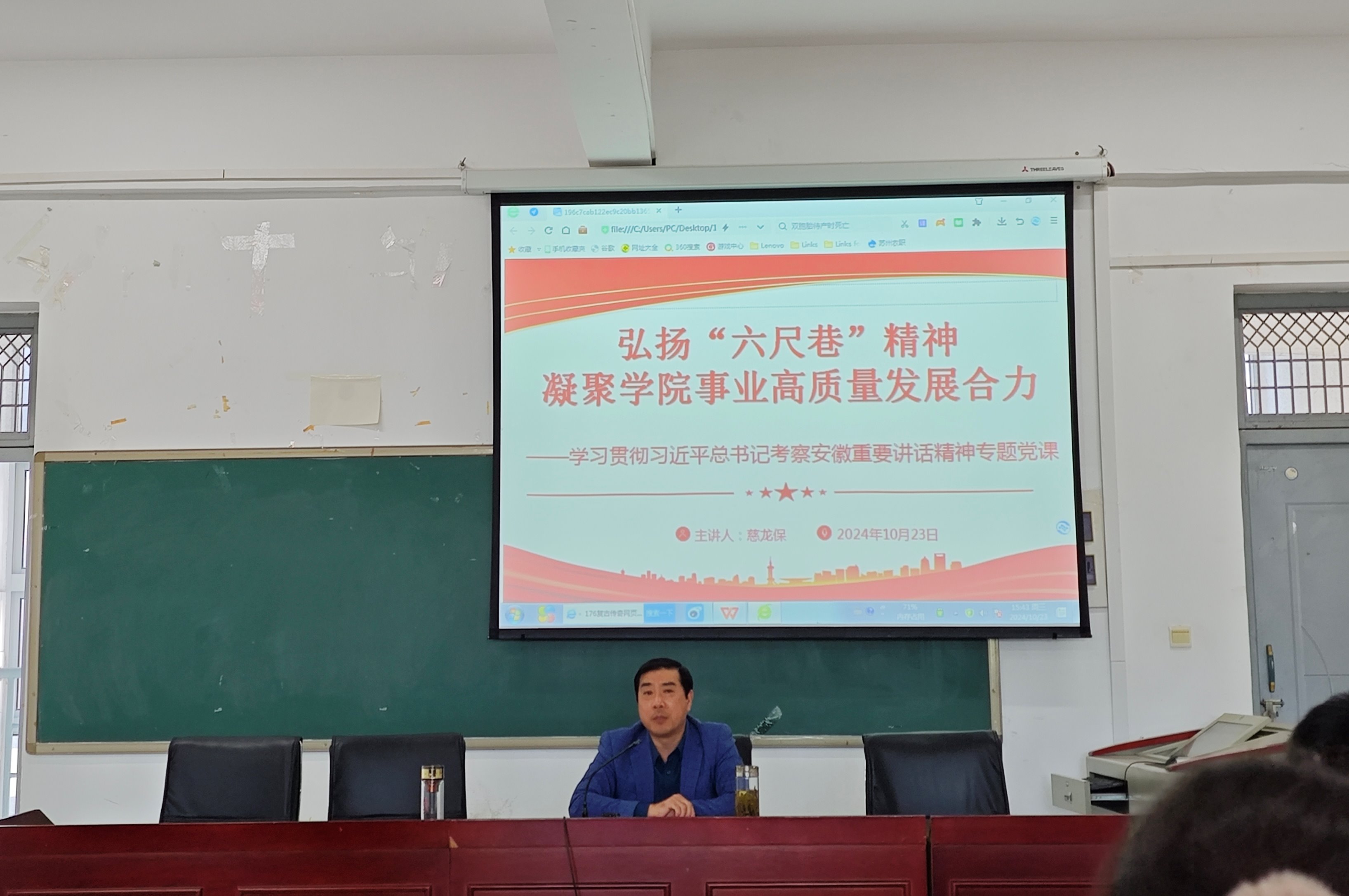 会议最后,慈龙保以“弘扬‘六尺巷’精神 凝聚学院事业高质量发展合力”为题开展了学习贯彻习近平总书记考察安徽重要讲话精神的专题党课。他以“六尺巷”的历史来源及文化内涵为引,结合学院当前工作,就如何弘扬“六尺巷”精神提出三点建议:一是要加强学习,继承和弘扬中华优秀传统文化,通过形式丰富的文化活动以文化人;二是要培养系统思维、战略思维,增强大局意识,学会换位思考,加强队伍建设和团队协作;三是要优化管理,提高服务意识和水平,密切联系师生,解决师生急难愁盼问题,营造和谐的育人环境和工作氛围,凝聚学院事业高质量发展最强合力,为早日实现学校“冲高升本”目标作出积极的更大的贡献!
