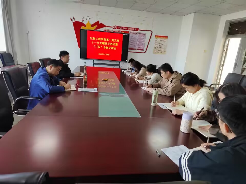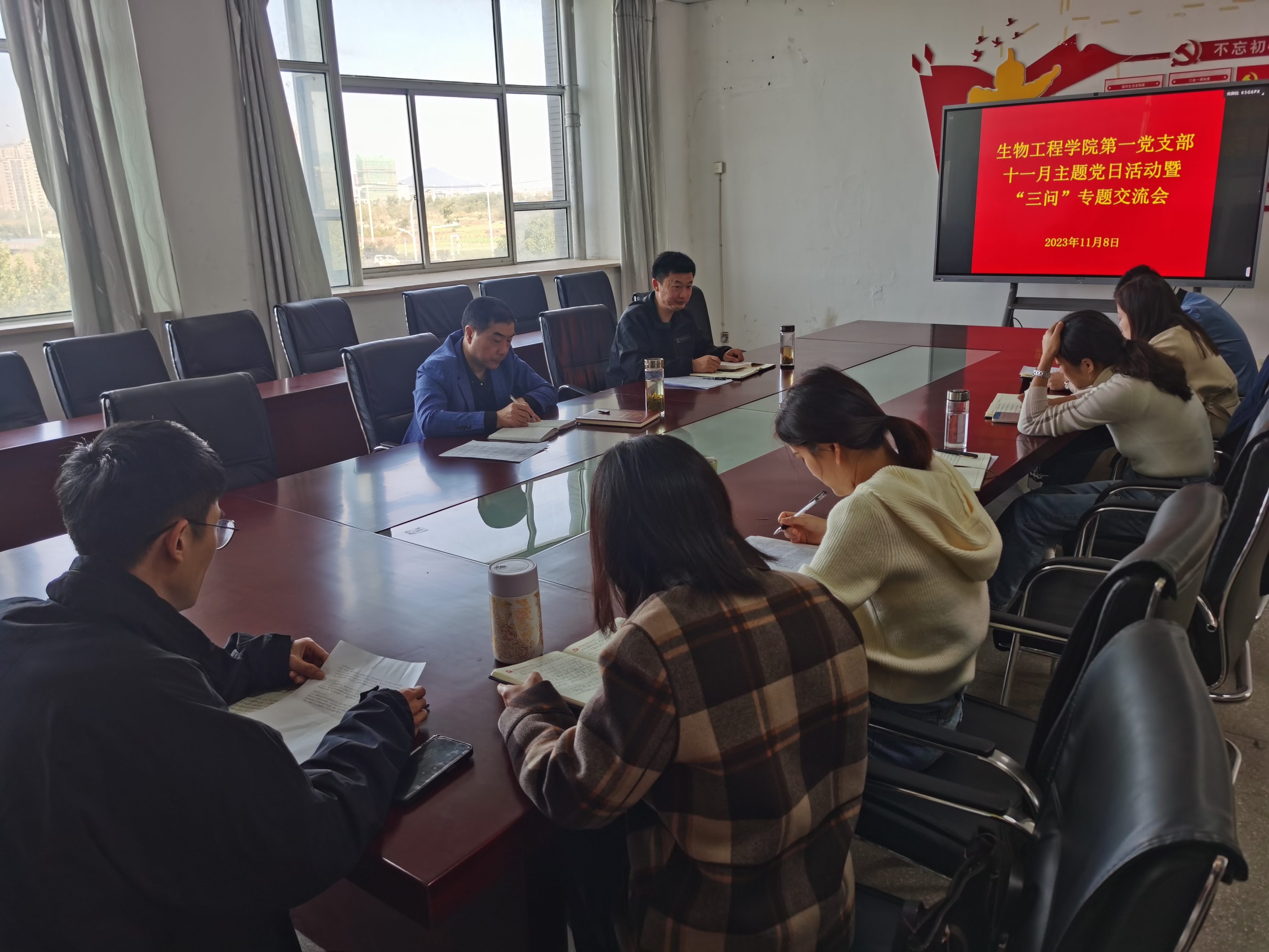 2023年11月9日下午,beat365中国官方网站第一党支部在生化楼B309室开展了十一月主题党日活动暨“三问”专题交流会,该院党总支副书记(主持工作)慈龙保、支部全体党员参加,支部书记范高福主持。