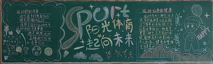 阳光体育,一起向未来。这一理念注重体育活动的快乐和健康。黑板报中的卡通小人和动物,充满着童真色彩,也表示着体育运动从小抓起,贯穿始终。彩色的字体,使整体风格充满阳光朝气之感,与主题相呼应。其中,黑板报的两侧还标注着运动的意义和运动时的注意事项,涵盖了什么是运动及怎样运动两个方面。整个黑板报围绕着健康体育,美好未来的核心理念开展。——24园林1班