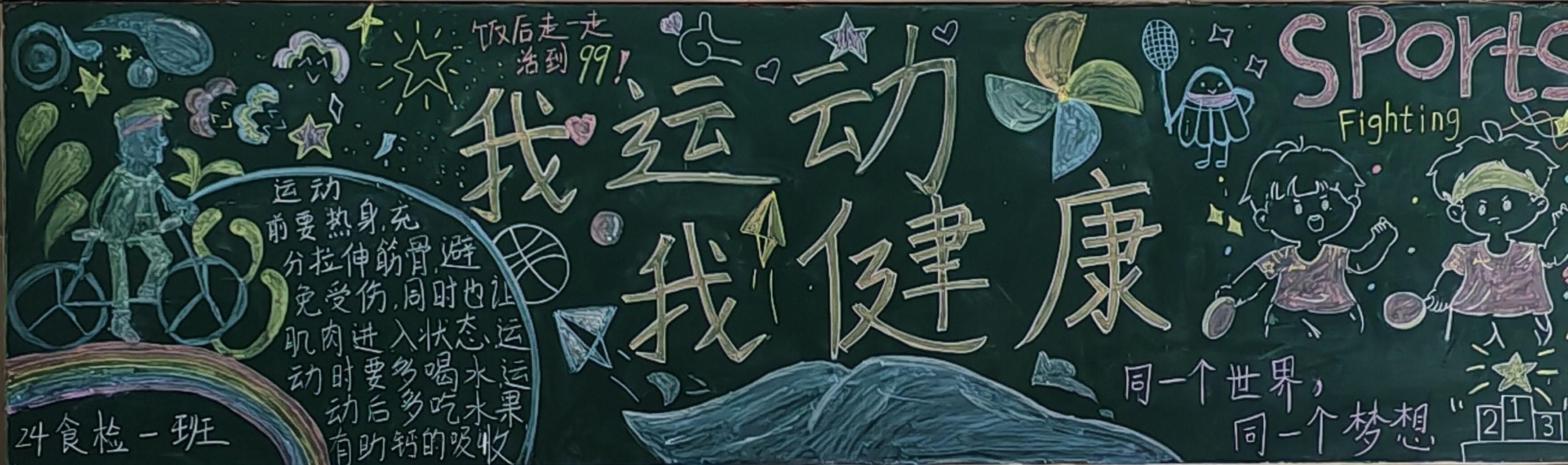 主题为我运动我健康,运动可以强身健体,改善人们的生活状态,本次黑板报运用了明亮且充满活力的色彩来传达健康的活力,具有代表性的运动员,激起我们对体育的热情,锻炼我们的身体,丰富我们的校园生活。——24食检1班