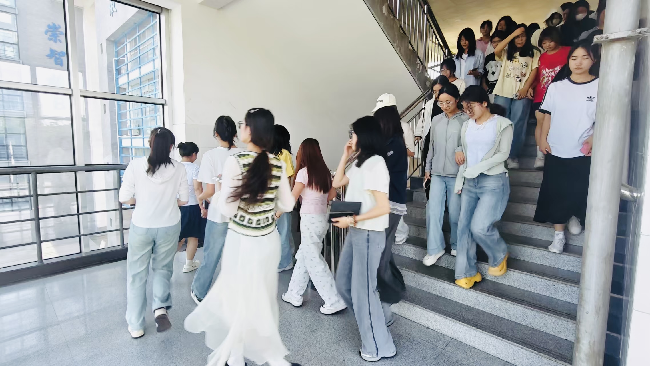 下午4点,随着地震警报响起,演练正式开始。辅导员转化成教室演练责任人,指挥学生快速抱头、闭眼,躲在各自课桌下或课桌旁,尽可能蜷曲身体,降低身体重心,并尽可能用书或者双手护住头部。解除“地震警报”信号发出后,辅导员打开教室前后门,组织学生按照紧急疏散路线有序撤离出教学楼,到达操场并进行清点人数。在疏散过程中,大家快速、有序撤离,没有出现拥挤、推搡、踩踏等意外情况。
