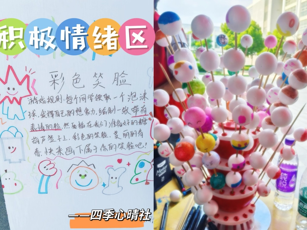 514日,在大学生活动中心广场前,彩色笑脸活动热闹开展。同学们纷纷拿起画笔,绘制出一个个色彩斑斓的笑脸。这些笑脸如同温暖的阳光,传递着积极情绪,让整个校园都充满了欢声笑语。