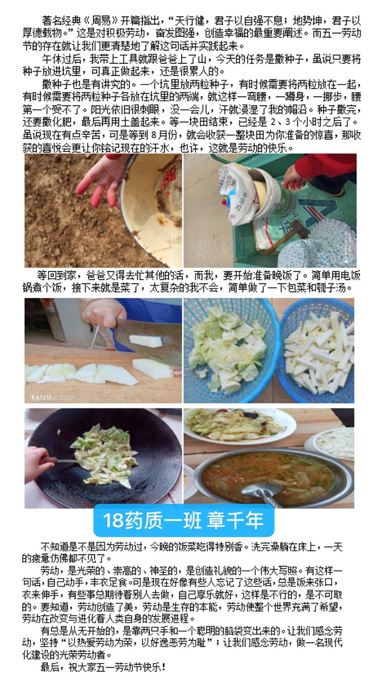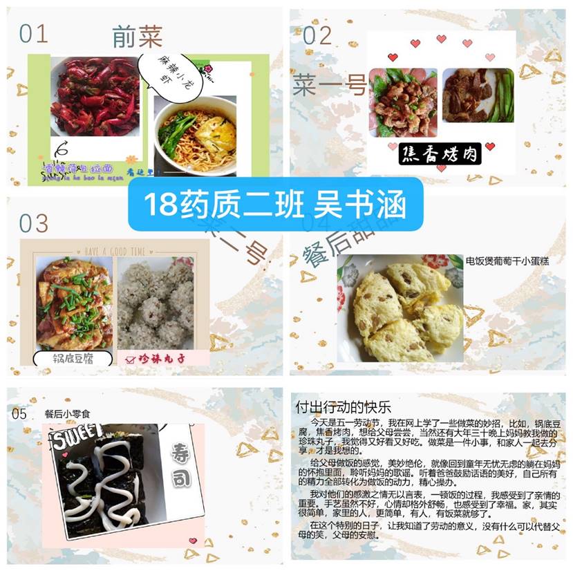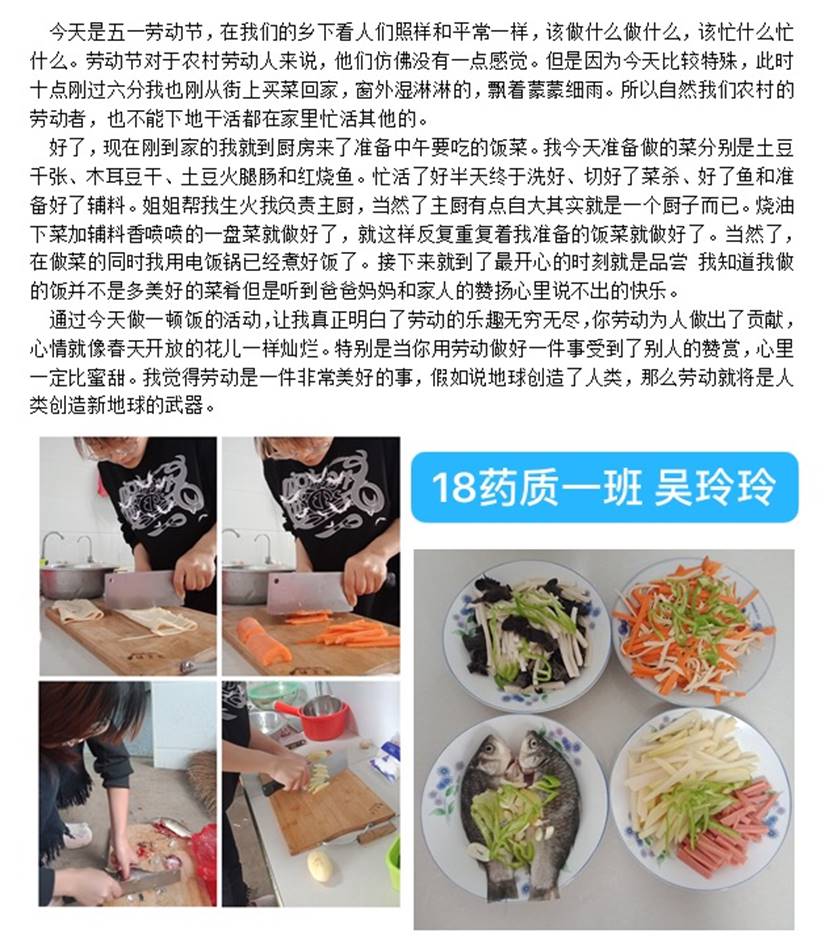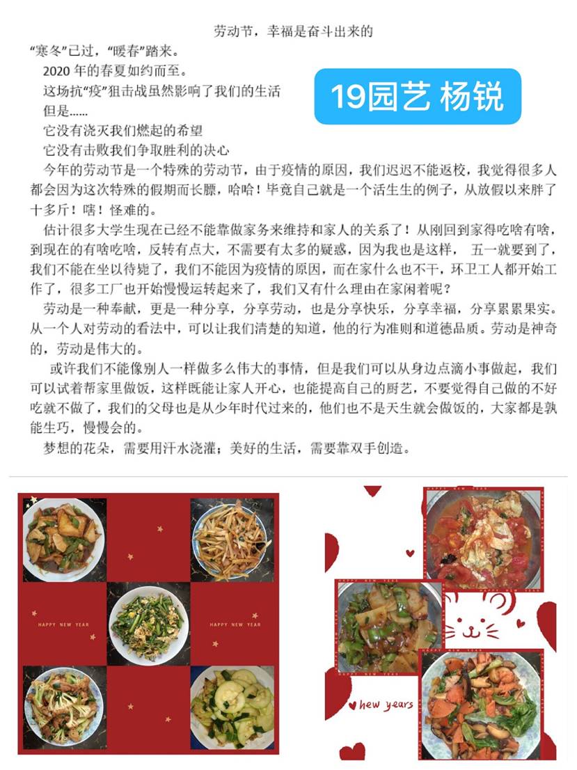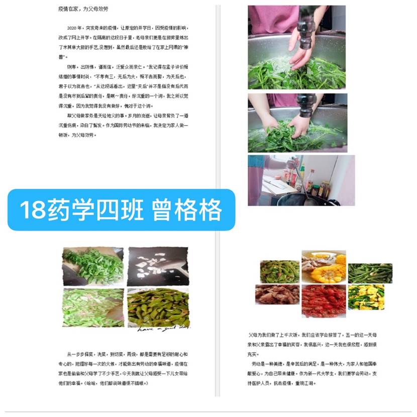 节日期间,活动开展得如火如荼,我院大学生通过为家人做一顿饭、全家大扫除、下地干农活等多种方式来炒热劳动节日的气氛。节后,收获了近百份学生劳动材料。经层层评选,最终我院诞生了十佳劳动之星!
