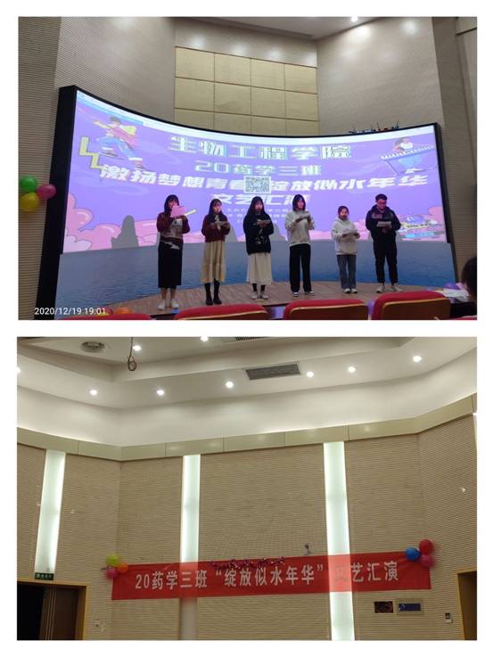 2020年12月19日晚七时整,beat365中国官方网站20级药学三班在鼓山校区图书馆二楼报告厅开展了以“激扬梦想青春 绽放似水年华”为主题的文艺汇演晚会活动。辅导员周媛老师、学生会部分成员以及药学三班全体同学参加了此次活动。