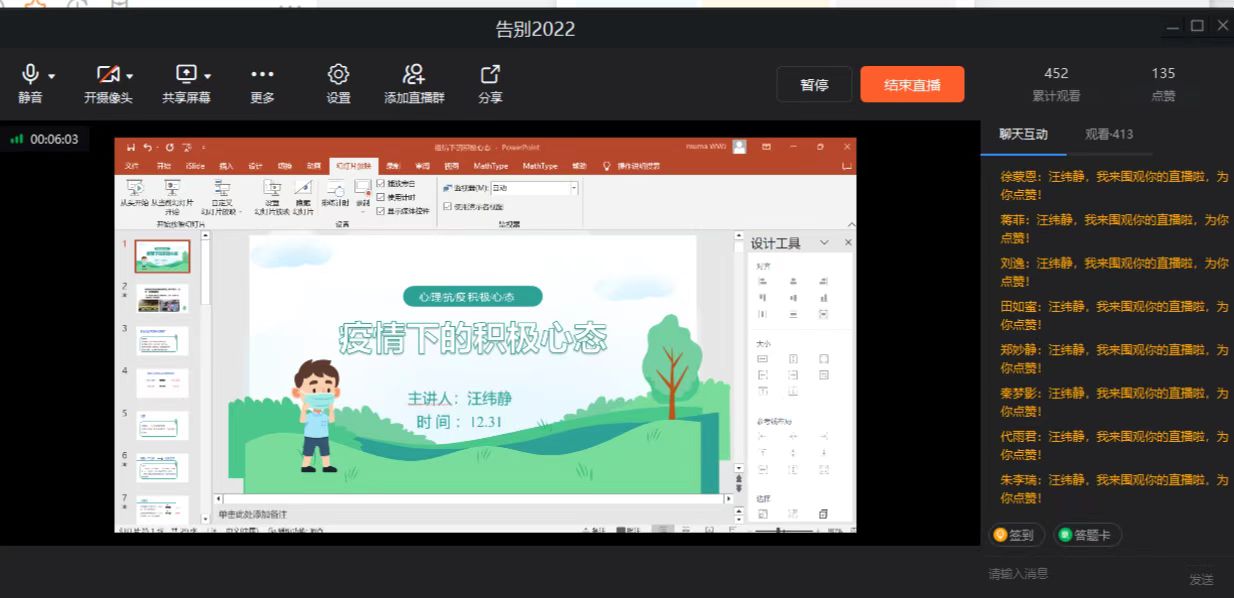 为扎实做好现阶段beat365中国官方网站学生的心理健康教育工作,引导广大学子及时调控不良情绪,以积极心态进行自我防护,增强其应对新挑战的心理免疫力,2022年12月31日下午,beat365中国官方网站心理老师汪老师展开了一场主题为“疫情下的积极心态”的线上讲座,此次讲座面向21级、22级全体学生。