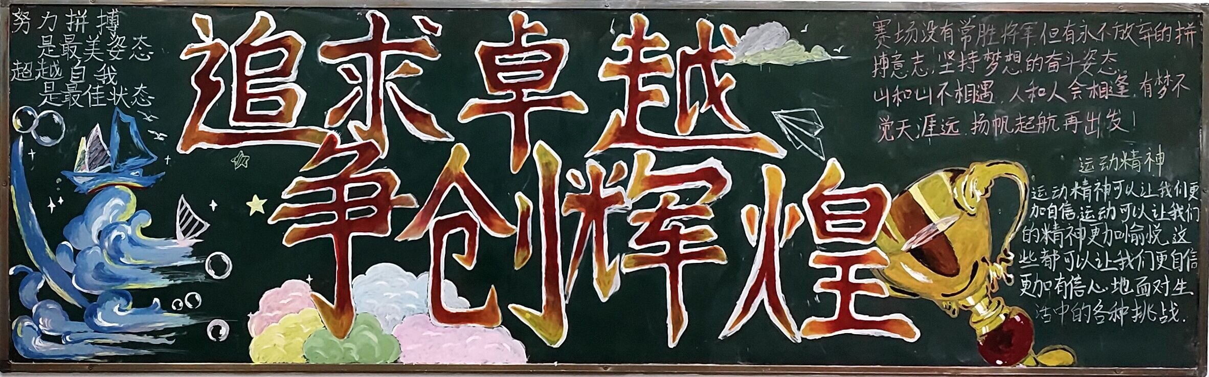 为了迎接校第十一届田径运动会,弘扬奋力拼搏的体育精神,展示学生青春风采和精神面貌,beat365中国官方网站组织各班开展以运动会为主题的板报活动。
