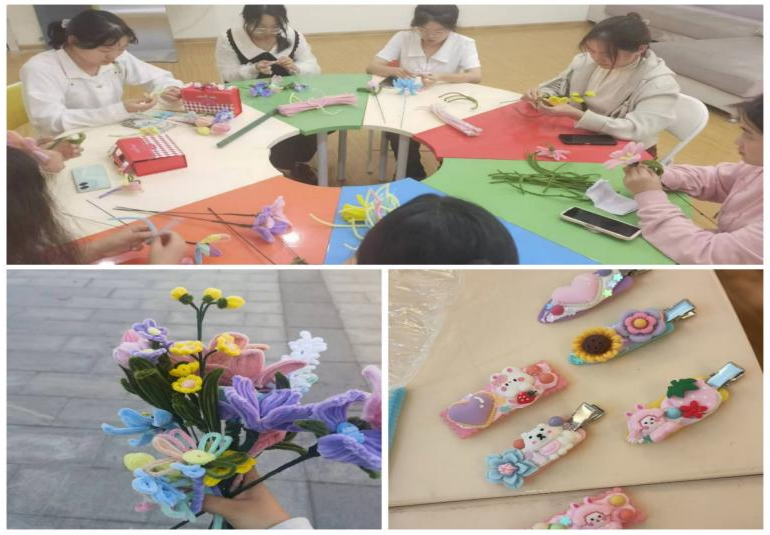 本次活动包括DIY发夹和扭扭花棒两个部分。活动伊始,社团成员便开动脑筋,发挥各自的创造力和想象力,在一次次巧手翻飞中,桌子上零散的小物件华丽蜕变成一个个精美的发夹,原本其貌不扬的扭扭棒在同学们的“扭一扭、弯一弯”中,变成了一朵朵色彩鲜艳的月季花、风铃花、郁金香......看着永不凋谢的花束,大家的成就感油然而生。活动最后,社团成员们把制作好的花束送给了生化楼里“润物细无声”的老师们,以此感激他们的辛勤付出。
