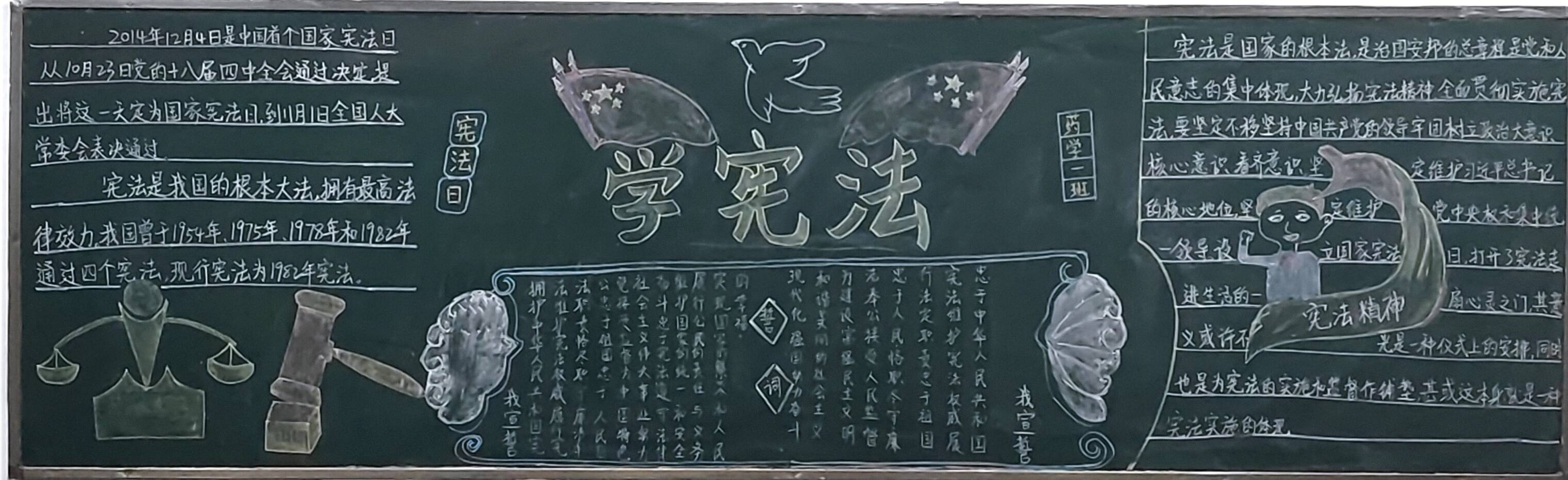 此次活动中,同学们都积极参与设计,板报内容积极向上,紧扣本次学习宣传宪法主题,板报上所展示的宪法,国旗,天平也有力地突出宪法公平公正的主题,彰显宪法权威。板报内容生动有趣,让同学们更加形象的了解宪法并宣传宪法,向我们展示了宪法是国家法治之根本,宪法保护我们的权利。同学们用画展示出他们心中的宪法,以及他们心中宪法的重要性,使此次活动更加有意义。