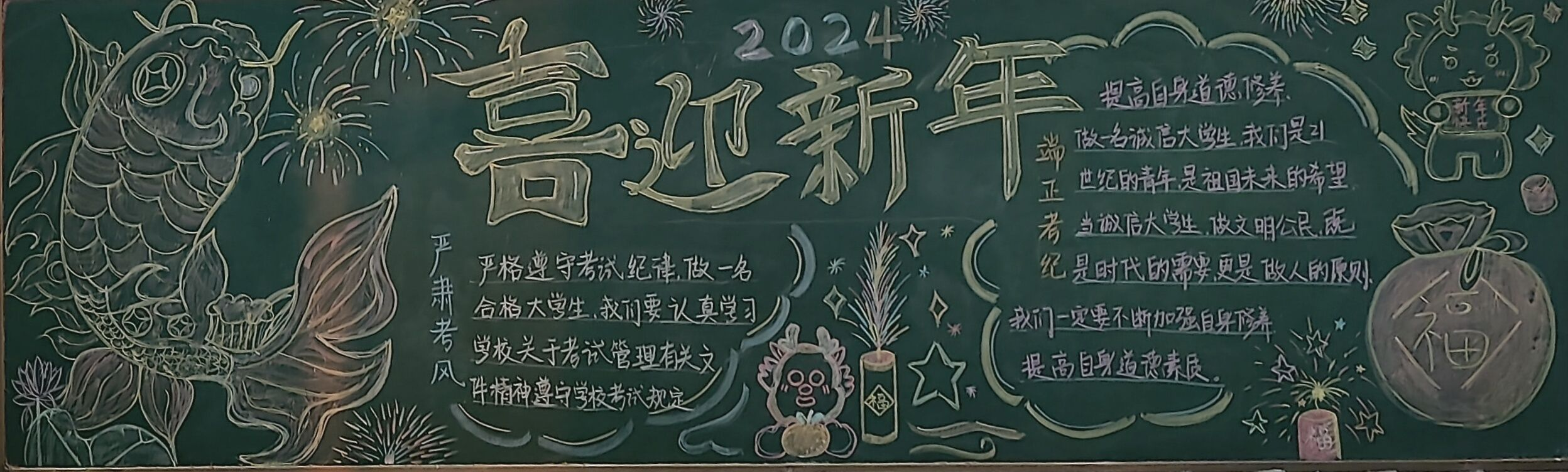 此次板报内容主要分为两部分,一个是喜迎新年,2024年即将来到,面对新的一年,同学们会有新的目标和新的愿望,可结合传统元素对黑板报进行创作。另一个主题是严肃考风考纪,学期即将结束之际,同学们将面临期末考试。不仅是对学习的总结,更是一个很好的对自己一学期所学知识的检测机会。其内容需要紧扣主题,积极向上。通过同学们辛苦积极的创作,板报内容丰富多彩。既展现了同学们对新年新气象的展望,也表现出对考试规则严格遵守的态度。板报中栩栩如生的龙,正如同学们一样龙图大展。在同学们画的鞭炮与烟花中,看到了璀璨夺目的大学生活。内容更能表达出同学们对期末考试的信心满满,正如同学们所说,诚信乃安身立命之本。