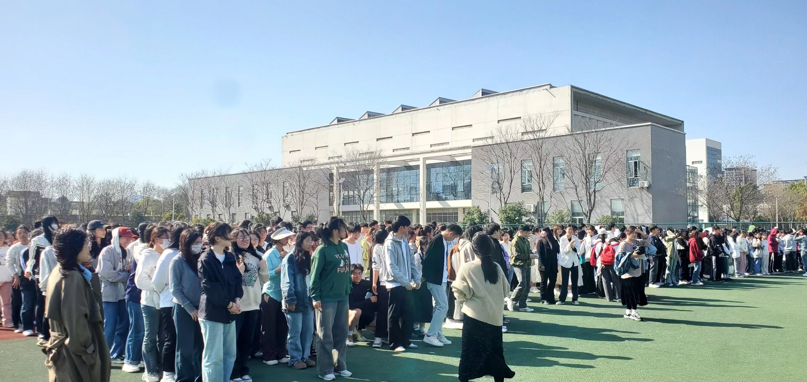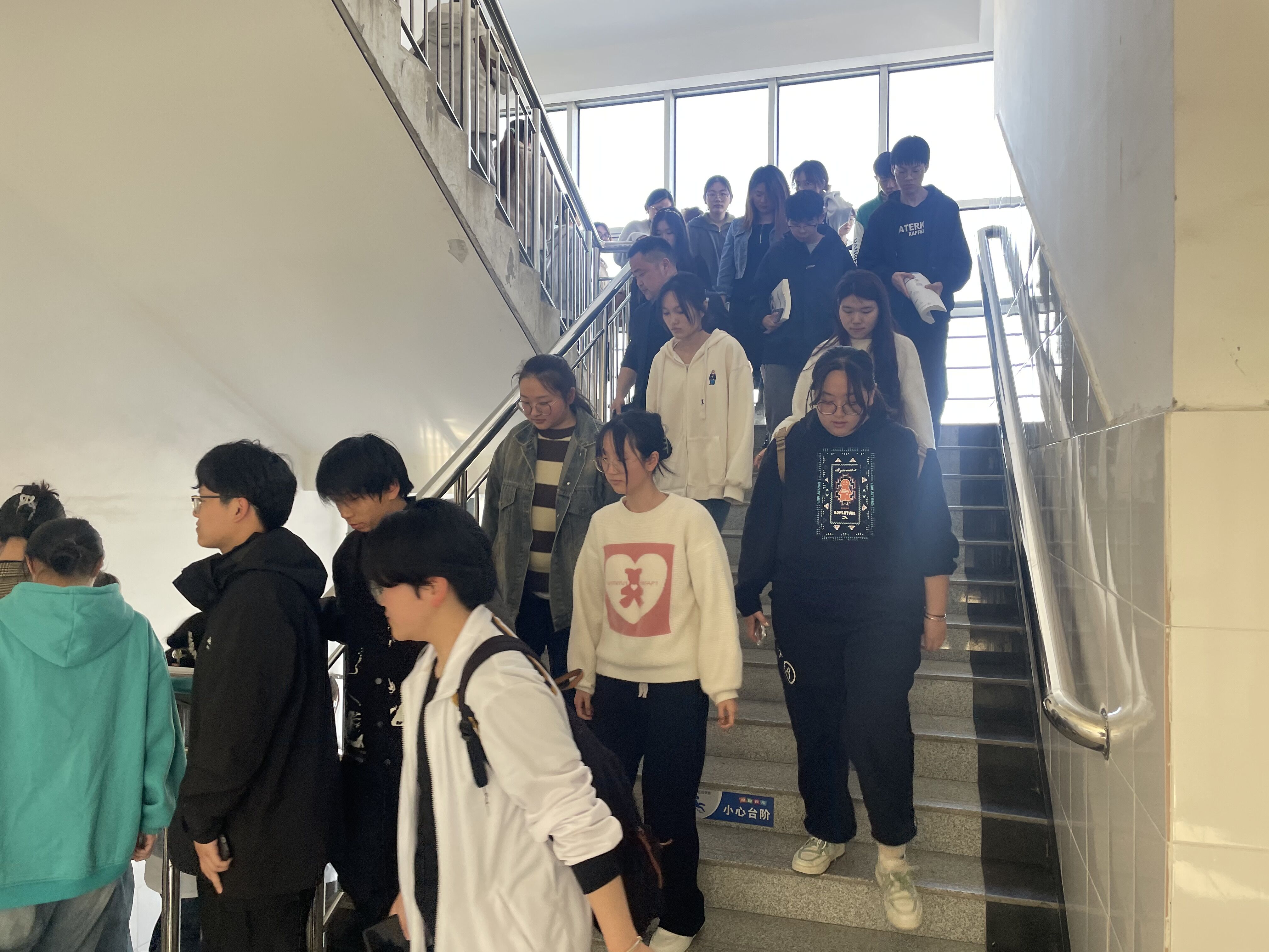下午3点20分,随着消防警报响起,演练正式开始。辅导员迅速到达指定点位,同学们放下书本、手捂口鼻、低头弯腰,奔向教室门口,按照预定疏散路线有序撤离出教学楼,到达操场并进行清点人数,整个过程用时3分50秒。在疏散过程中,大家安静、快速、有序撤离,没有出现拥挤、推搡、踩踏等意外情况。
