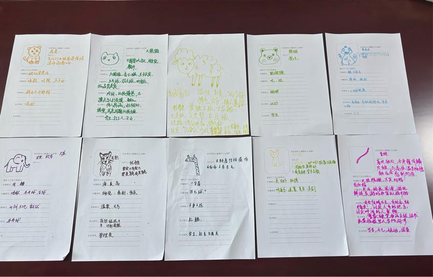 茶话会的首个环节名为“动物园里有什么”,通过这个破冰小游戏瞬间缩短了同学们之间的距离,增强了同伴间的信任感。接下来,同学们来到“自我探索动物园”,他们需要在纸上画出与自己最相像的动物,“大象”、“长颈鹿”、“三花猫”、“变色龙”……简单的思考后,一个个动物跃然纸上,他们头头是道地给彼此分享着这只动物与自己的联系,现场氛围轻松自在。在之后的他人评价中,小组成员进行了真诚深刻的对话,在交流探讨中强化了自我认知。心理老师由此引出“乔韩窗口”理论——一种重要的探索自我方式。