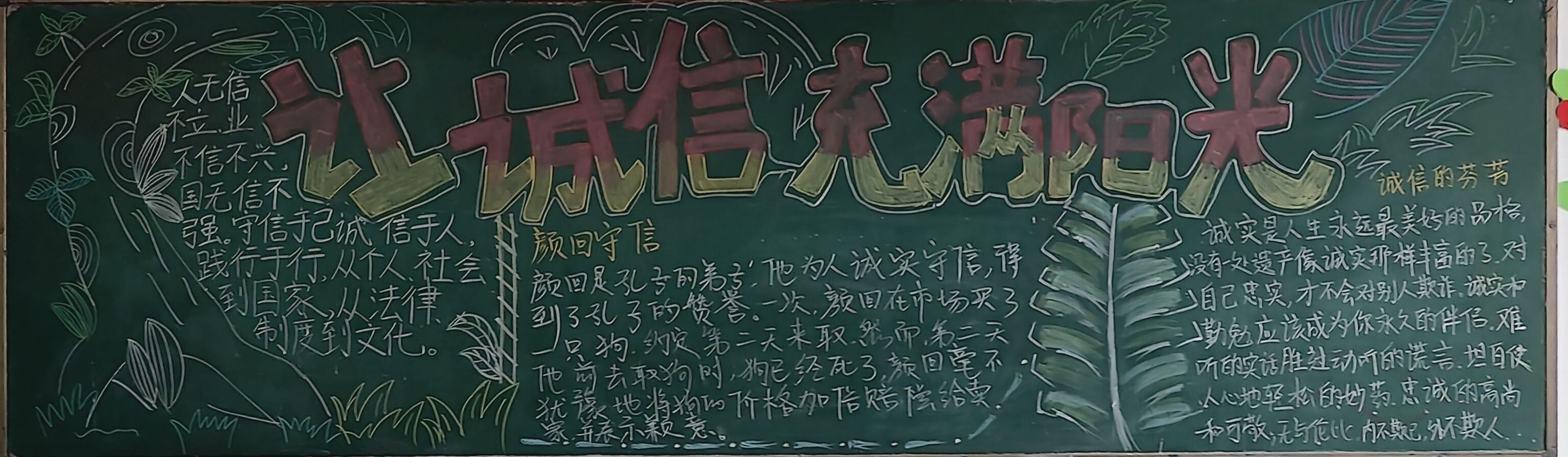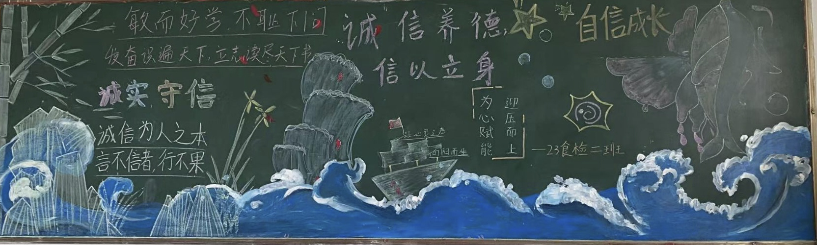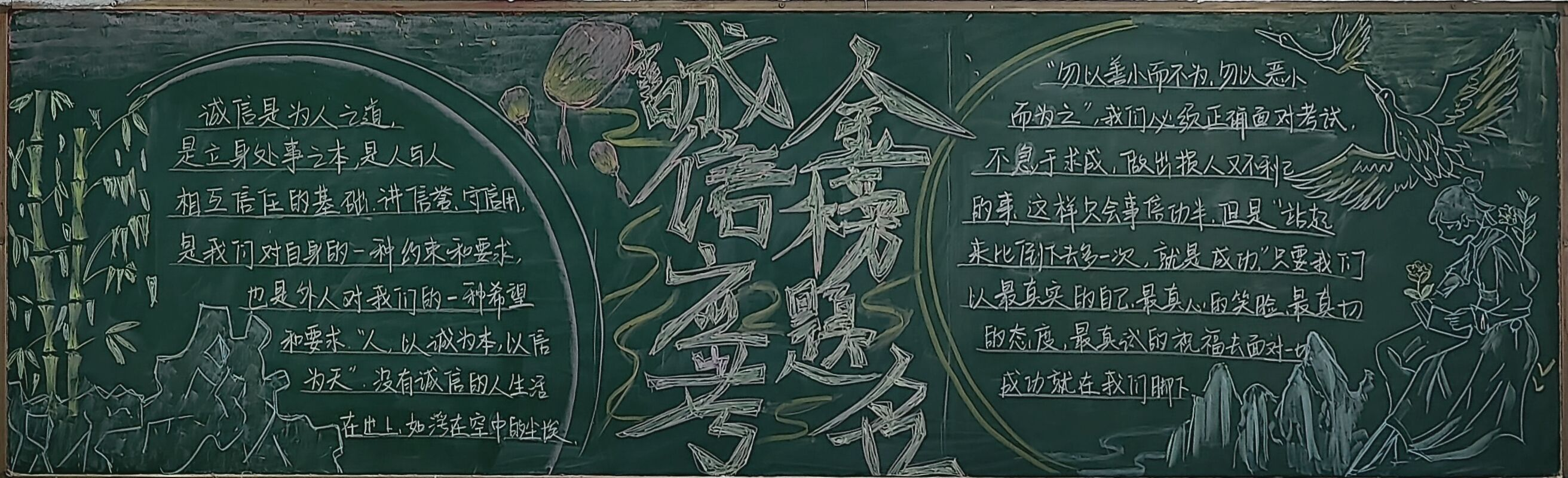 在黑板报内容上大家都以诚信为主题,描绘出对诚信考试特别的见解,在黑板报设计上,同学们创意十足以醒目的标题、丰富的内容和精美的版面设计吸引了众多师生的目光。标题“诚信考试”字体刚劲有力,表明了学生对于诚信考试的重视,同学们巧妙地运用了色彩、线条和图案,使得整个黑板报美观又大方。在制作黑板报的过程中,学生们表现出了极高的热情和积极性,在内容、板书与文宇、插图与美工、排版与设计、标题与创新上各放异彩。他们自发组织团队,分工合作,共同探讨如何更好地呈现主题和内容,共同为黑板报的制作贡献着自己的力量。