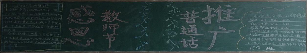 本次黑板报分为2个主题:感恩教师节与推广普通话,中间以两个藤条分隔开,简结且明了,左边是一首感恩教师的诗词,右边是推广社会主义核心价值观。——23药学一班
