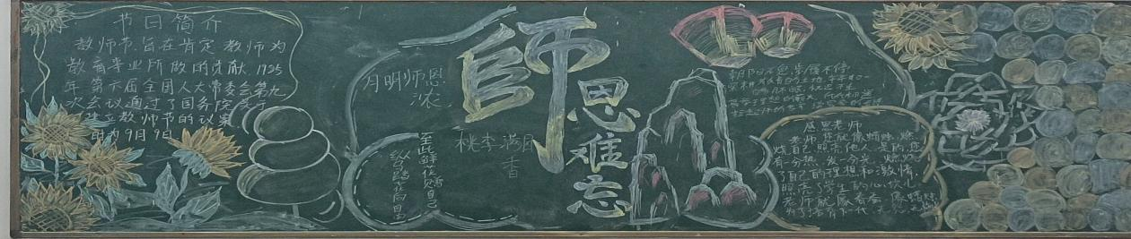 在第40个教师节来临之际,我校开展了“金秋桃李 师恩难忘”为主题的板报展示活动,同学们纷纷献上诚挚的祝福,用自己的方式表达对老师的敬意,给辛勤工作的老师们送上了一份诚挚的节日祝福。