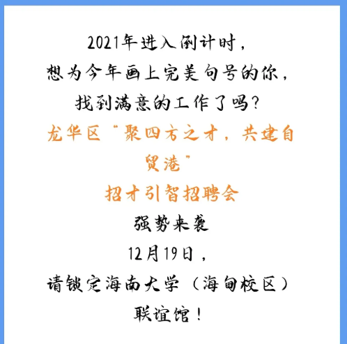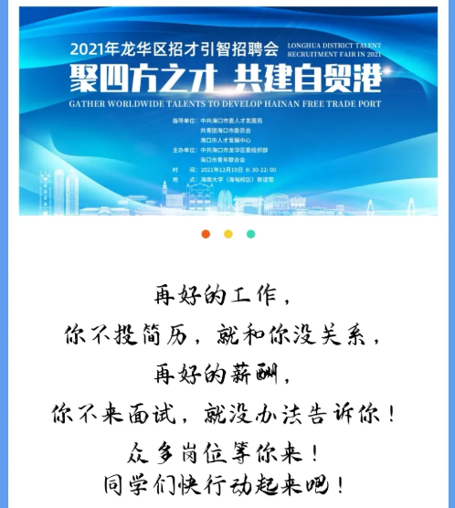 海口市龙华区2021年招才引智招聘会(365英国上市官网专场)定于12月19日(本周日)上午08:30-12:00在联谊馆举行,此次参会单位包含了外国政府驻华机构、国企、民营企业等36家用人单位单位,提供的岗位年薪均在6万以上,请大家积极参加!