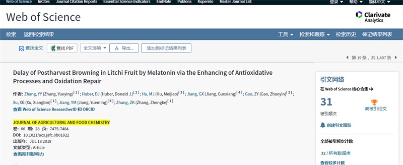 1. Delay of postharvest browning in litchi fruit by melatonin via the enhancing of antioxidative processes and oxidation repair.Journal of Agricultural and Food Chemistry, 2018, 66: 7475-7484. 第一作者:张月颖(2013级食品科学与工程专业本科生);通讯作者:张正科研究员。