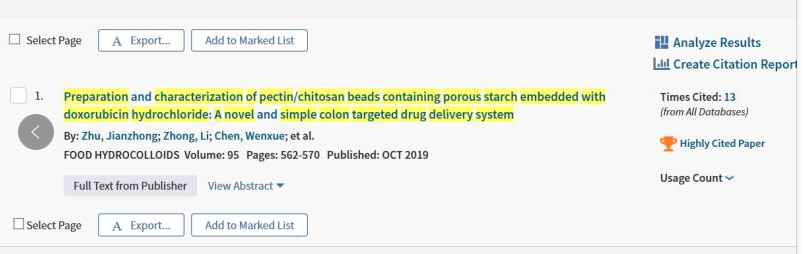 2. Preparation and characterization of pectin/chitosan beads containing porous starch embedded with doxorubicin hydrochloride: A novel and simple colon targeted drug delivery system.Food Hydrocolloids, 2019, 95: 562-570. 第一作者:朱健忠(2013级食品科学与工程专业本科生);第一通讯作者:陈海明副教授;第二通讯作者:陈卫军研究员。