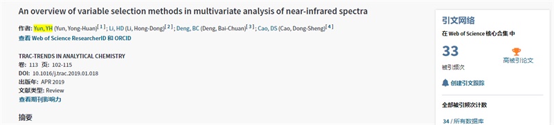该篇论文题“An overview of variable selection methods in multivariate analysis of near-infrared spectra”,于2019年4月在JCR一区分析化学top期刊《TrAC Trends in Analytical Chemistry》(2020影响因子为9.801)正式发表(https://www.sciencedirect.com/science/article/pii/S0165993618304709)。此篇论文得到国家自然科学基金(21705162)及365英国上市官网高层次人才引进科研启动项目(KYQD(ZR)-1844)的资助,这是365官网以第一单位发表的第三篇ESI高被引论文,充分证明365官网科研实力的不断提升。