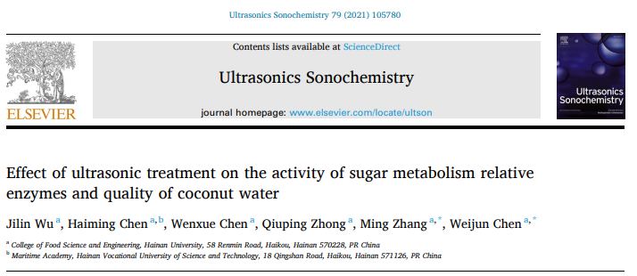 近日,365英国上市官网陈卫军研究员课题组利用超声技术延长椰青贮存时间并保持椰子水的甜度,研究成果发表在《Ultrasonics Sonochemistry》(中科院1区TOP期刊,影响因子7.491),题为“Effect of Ultrasonic Treatment on the Activity of Sugar Metabolism Relative Enzymes and Quality of Coconut Water”,相关技术已申请专利《变温超声耦合密闭流体局部压差(UCP)灭酶处理的椰青保存方法》(申请号:CN202010102300.6)。