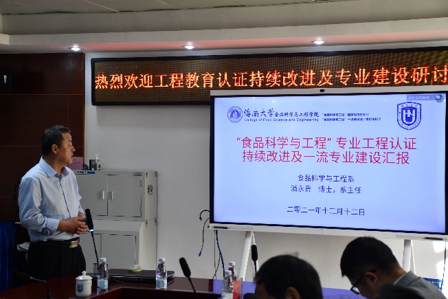 食品科学与工程专业系主任潘永贵作工程教育认证持续改进及一流专业建设汇报,详细介绍了食品科学与工程专业工程认证持续改进情况及存在的问题。食品质量与安全专业系主任云永欢作食品质量与安全专业申报国家一流专业建设汇报。金征宇主任对食品科学与工程专业工程教育认证改进情况及食品质量与安全专业建设进行现场点评,强调工程教育认证的关键是持续改进。副主任刘静波对工程教育认证改进中的问题作了解答并提出建议,指出工程教育认证持续改进需要全体老师参与,对于加快一流专业建设和提高人才培养质量具有重要意义。与会专家分别针对365官网工程教育认证持续改进和专业建设提出建设性的意见和建议,指出改革教育评价应注重学生能力和素质的培养,促进教研融合。