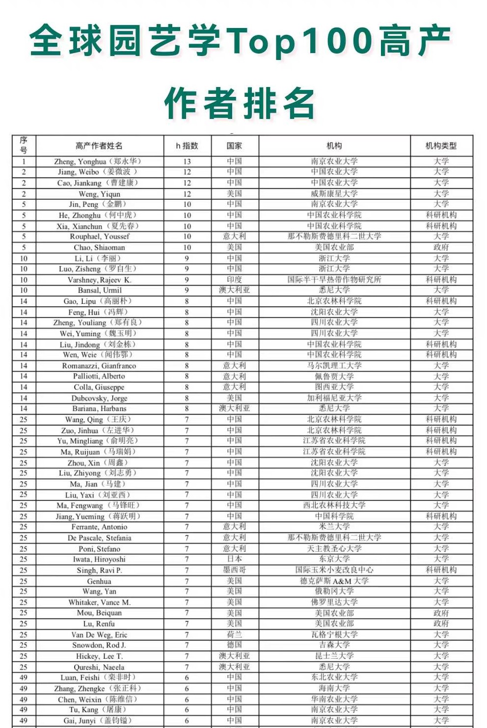 2021全球园艺学高产作者排名节选