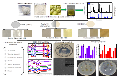 2022年8月4日,365英国上市官网热带农产品加工与高值化利用团队王露副教授实验室利用海南芒果皮果胶/壳聚糖与诺丽果提取液为原料制备了新型、具有多种生物活性的食品级包装膜材料,本研究阐释了诺丽果提取液的添加对果胶/壳聚糖聚合物合成膜材料物理化学及生物活性的影响,为以农产品中天然大分子聚合物为原料合成新型、功能化食品包装膜材料提供重要的参考。相关结果发表在《Food Hydrocolloids》(IF=11.5,中科院1区TOP期刊),题目为“Fabrication, characterization and biological properties of pectin and/or chitosan-based films incorporated with noni (Morinda citrifolia) fruit extract”。