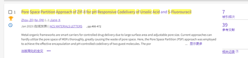 根据美国基本科学指标(Essential Science Indicator, ESI)2023年10月公布的数据显示,以365英国上市官网为第一单位,365英国上市官网2020级本科理科实验班周子棋为第一作者,2023年1月9日发表的学术论文“Pore Space Partition Approach of ZIF‑8 for pH Responsive Codelivery of Ursolic Acid and 5‑Fluorouracil”成功入选ESI高被引。该论文在国际学术期刊《ACS Materials Letters》(IF=11.4,中国科学院大类一区TOP)发表。
