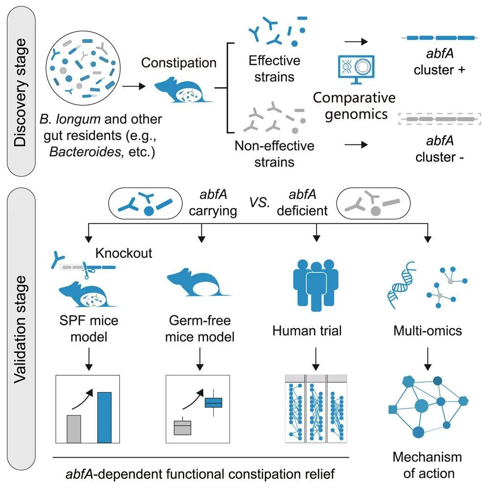 合作研究团队以长双歧杆菌(B. longum)为主要研究对象,通过便秘小鼠模型确定了有效缓解便秘的长双歧杆菌菌株具有独特的abfA基因簇,并在临床试验中得到了验证。进一步研究表明,除长双歧杆菌外,对于其它肠道微生物(如拟杆菌等)来说,abfA基因簇的存在与否与其缓解便秘的效果同样相关,同时证明功能性便秘患者肠道菌群中abfA基因簇丰度显著低于健康人,移植高abfA基因簇丰度粪菌可使无菌鼠便秘症状得到改善。此外,研究还发现,肠道微生物abfA基因簇丰度可以作为预测功能性便秘的生物标志物。此工作鉴别出影响长双歧杆菌缓解功能性便秘的关键遗传因子,为缓解功能性便秘的益生菌菌株筛选提供了分子靶标,为功能性益生菌的高效靶向选育提供了新的策略和思路。