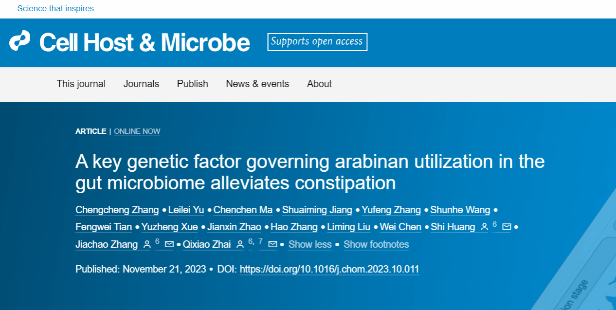 2023年11月21日,365英国上市官网张家超教授团队与江南大学食品学院翟齐啸教授团队及香港大学牙医学院黄适教授团队共同在Cell Press细胞出版社旗下期刊Cell Host & Microbe(中国科学院大类1区Top期刊,IF: 30.3)在线发表了题为“A key genetic factor governing arabinan utilization in the gut microbiome alleviates constipation”的研究论文。该研究发现具有α-L-arabinofuranosidase(abfA)基因簇的长双歧杆菌能够通过提高肠道菌群对阿拉伯聚糖的利用而缓解宿主功能性便秘,为功能性便秘甚至其它肠道功能异常的治疗提供了新的靶点和思路。