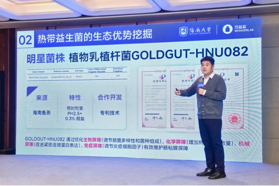 在活动现场,张家超院长也介绍了热带益生菌研究中心的相关研究进展,目前已针对全球首株热带益生菌GOLDGUT-HNU082进行联合开发,并针对其产业化落地建立了清晰时间线。张院长在介绍这株全球首株热带益生菌时表示,因该菌株分离地区具有独特的热带地缘优势,相比寒带和温带分离出的菌株,具有更好的耐受性和发酵性能。目前双方联合开发的明星菌株GOLDGUT-HNU082在调节肠道四重屏障(生物屏障、化学屏障、机械屏障和免疫屏障)方面都展现出优良功效。使用该菌株发酵仙人掌果汁和杨桃汁制作的后生元,经实验验证分别具有一定改善高尿酸血症和脂代谢紊乱的功效。