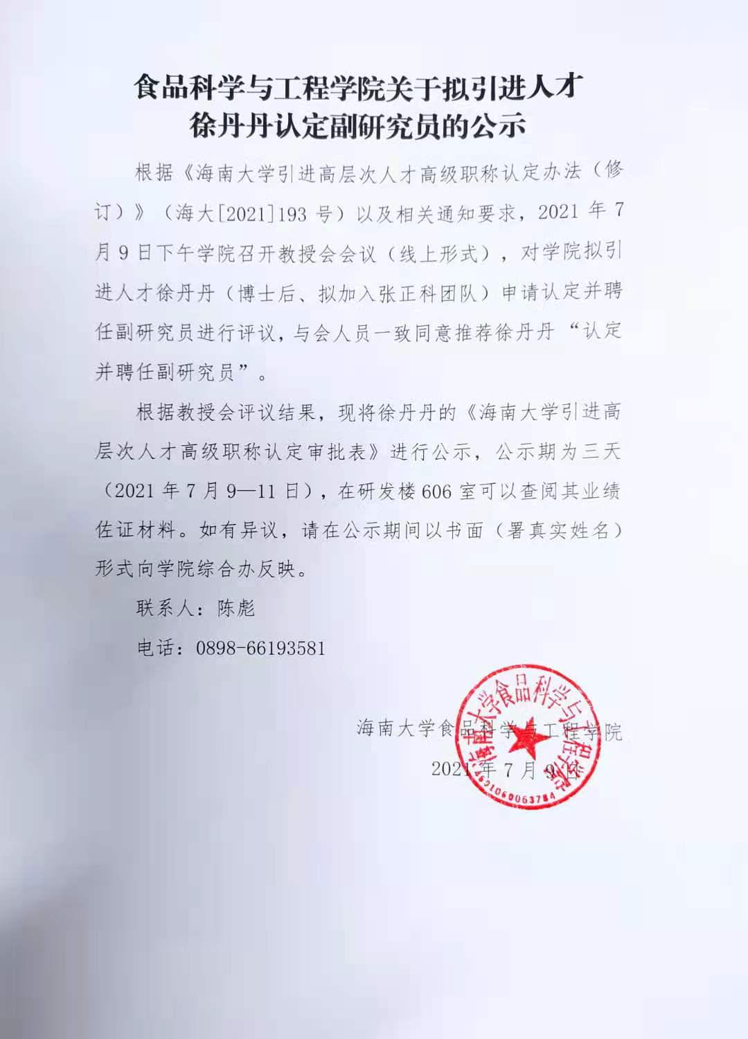 365英国上市官网关于拟引进人才徐丹丹认定副研究员的公示