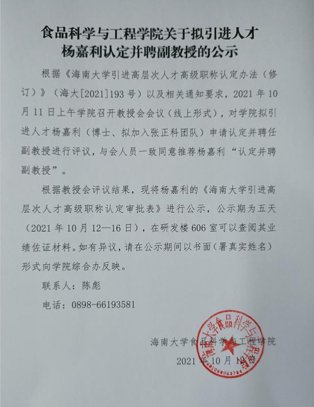 365英国上市官网关于拟引进人才杨嘉利认定并聘副教授公示