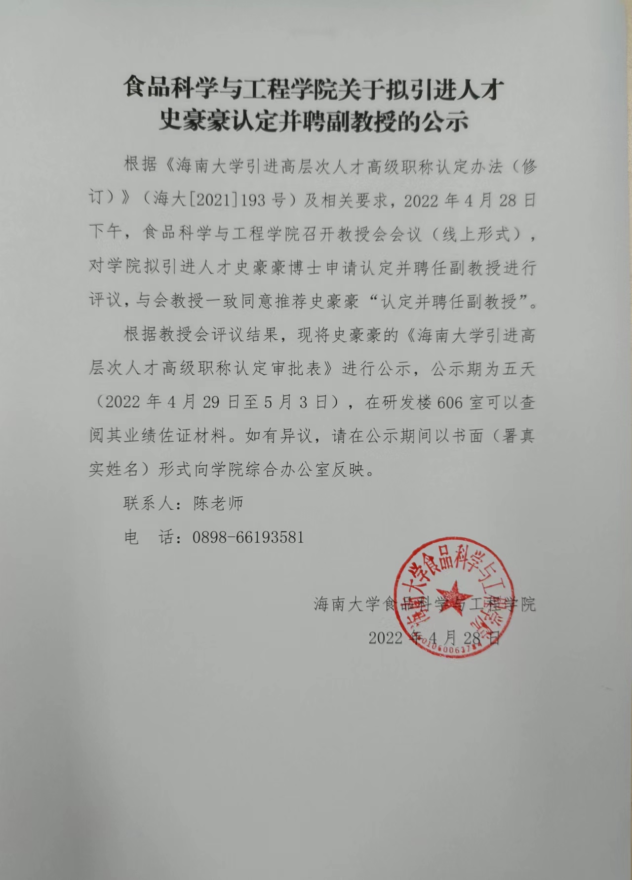 365英国上市官网关于拟引进人才史豪豪认定并聘副教授公示