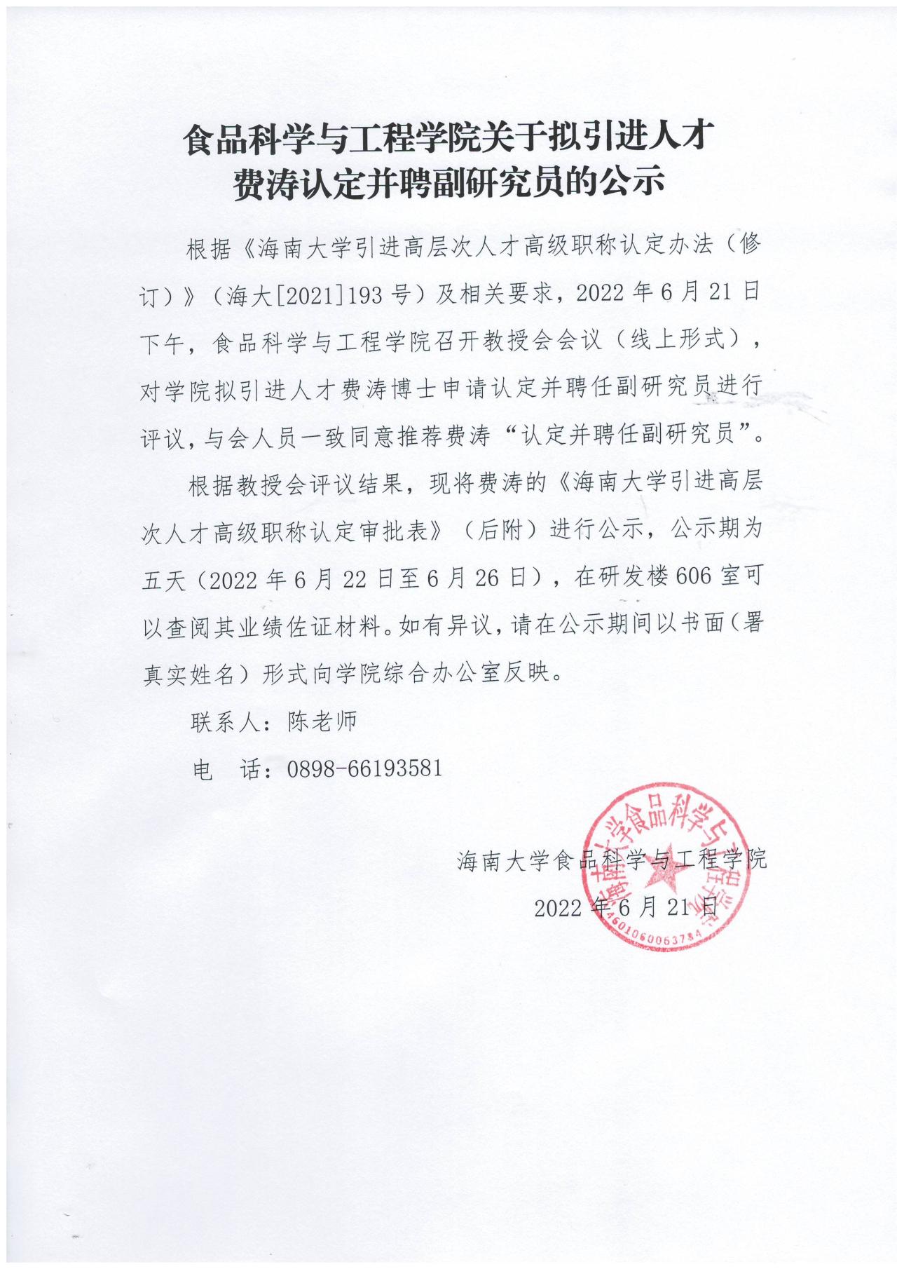365英国上市官网关于拟引进人才费涛认定并聘副研究员公示